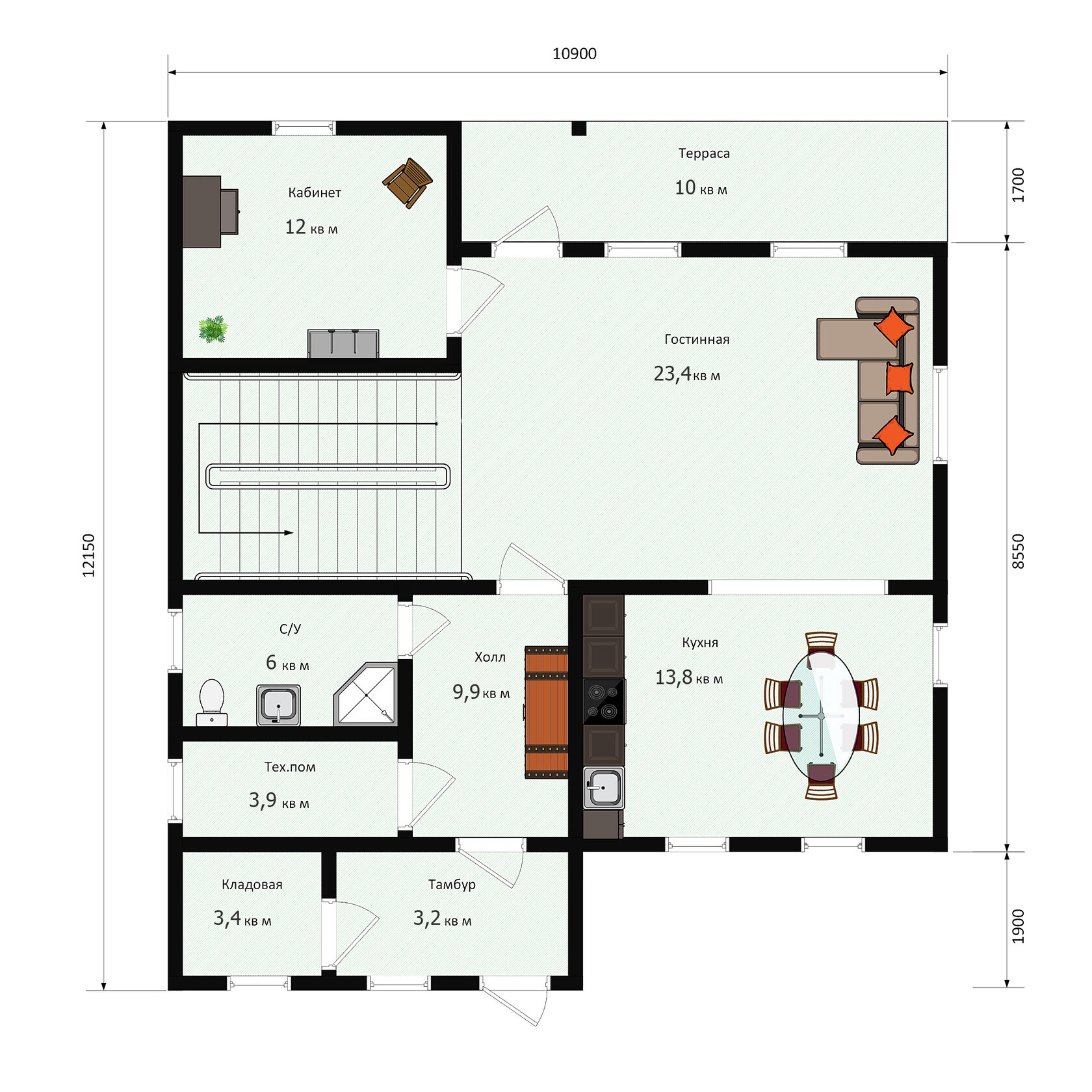 2 санузла, личный кабинет, места для хранения и, конечно, просторная гостиная