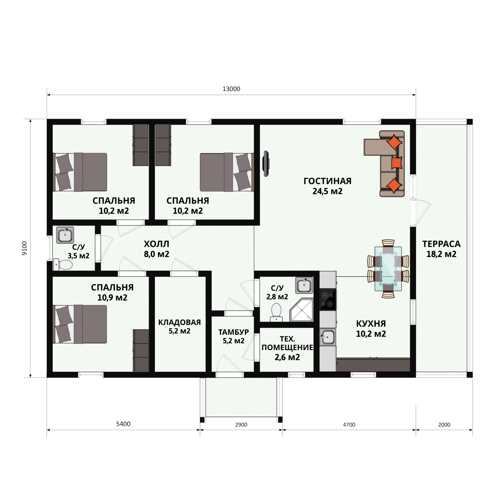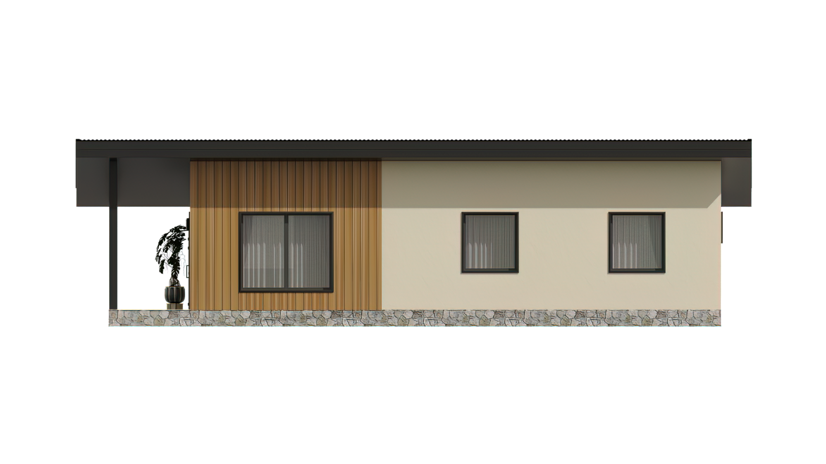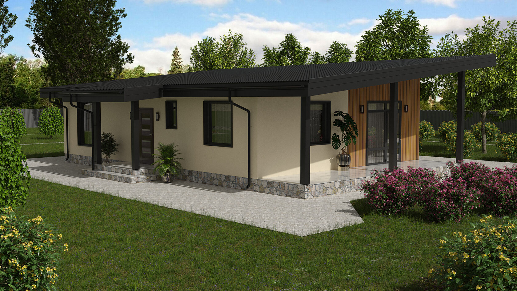 Готовый проект дома для комфортного проживания семьи: 3 спальни, 2 санузла, места для хранения и, конечно, просторная гостиная с высокими потолками. Коттедж в СОВРЕМЕННОМ стиле будет гармонично смотреться на уединенном участке и в коттеджном поселке. Как и в большинстве подобных проектов, здание дополнено террасой.